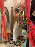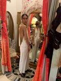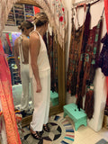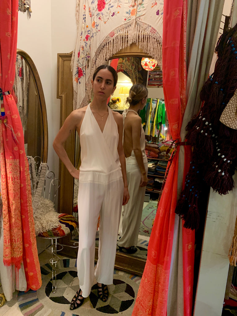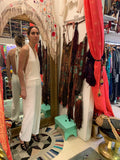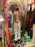 White crepe jumpsuit with halter neckline, drop-waist and low back. Very Bianca Jagger at Studio 54!