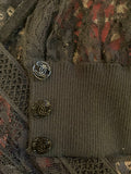Incredibly beautiful and elegant lace long collared cardigan with drapey sleeves by Chanel. Ribbed fabric collar and waist. Original label is off but the original branded buttons read Chanel (please see detail photos).