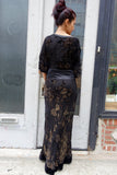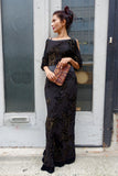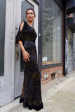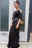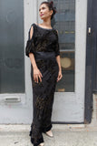 Great designer dress with burnout velvet floral and metallic pattern. Shoulders are cut out. Dress is made of silk and viscose.