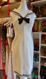 Classic sleeveless sailor dress, with a black patent leather bow detail in front. The collar buttons down to the waist in back. Material is a waffle textured cotton. Great design inspiration piece.