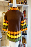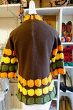 Very '70s brown acrylic mock turtleneck sweater with yellow, orange and green knit circles pattern. Zips at neck.