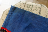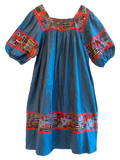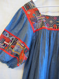 Very unique soft cotton denim dress with patchwork print embellishment across the chest, the sleeves and the bottom of the dress. Loose pleating from the bib area down. Full, flowy and sweet hippie dress that’s one-of-a-kind. Great for all seasons.