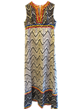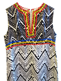 Visually stunning Jean Varon print dress with zig zag red and yellow ribbon trim. Dress dates from the 1960's with tag that says Jean Varon, Made in England. Fabric is a silky satin with a very thin ribbing. The dress is fully lined.